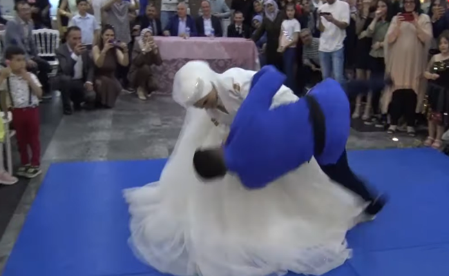 ودخل العروسان طلحة أنيس أريوغلو (23 عاما) وعمران شابال (23 عاما) في مدينة دنيزلي متروبوليتان بيليسبور إلى القاعة مرتدين ملابس الجودو، فوق ملابس الزفاف قبل أن يقوما بمباراة استعراضية قبل الزفاف، حيث أقدمت العروس على طرح ‏العريس أرضا في 4 حركات متنوعة، فبل أن يوقعا على عقد الزواج. (RT)