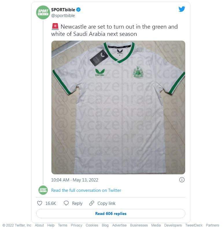 ونشر حساب صحيفة “ديلي ميل”، صورة مسربة لقميص نيوكاسل الجديد لخوض مبارياته خارج أرضه مصمم باللون الأبيض مع خطوط خضراء على الرقبة والأكمام، شديد الشبه قميص المنتخب السعودي، كما أن شعار الفريق وشركة “كاستور” المصنعة له سيكون باللون الأخضر.