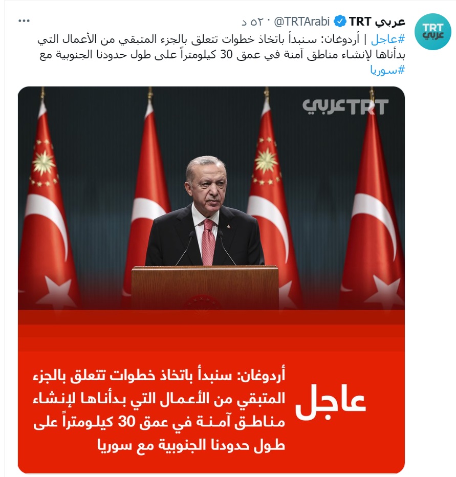 أردوغان: سنبدأ باتخاذ خطوات تتعلق بالجزء المتبقي من الأعمال التي بدأناها لإنشاء مناطق آمنة في عمق 30 كيلو متراً على طول حدودنا الجنوبية مع سوريا