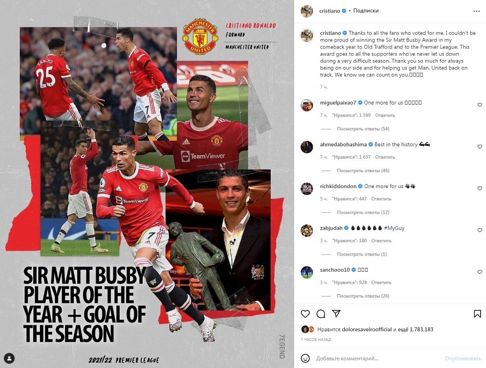 وكتب رونالدو، رسالة عبر حسابه على موقع “إنستغرام”، جاء فيها: “شكرا لكل المشجعين الذين صوتوا لي. لا يمكنني أن أكون أكثر فخرا من كوني فائزا بجائزة السير مات باسبي في عام عودتي إلى أولد ترافورد وإلى البريميرليغ. هذه الجائزة تعود إلى جميع المشجعين الذين لم يخذلوننا قط خلال موسم صعب للغاية. شكرا جزيلا على وقوفكم دائما إلى جانبنا وعلى مساعدتنا في إعادة مانشستر يونايتد إلى المسار الصحيح. نحن نعلم أنه يمكننا الاعتماد عليكم”.