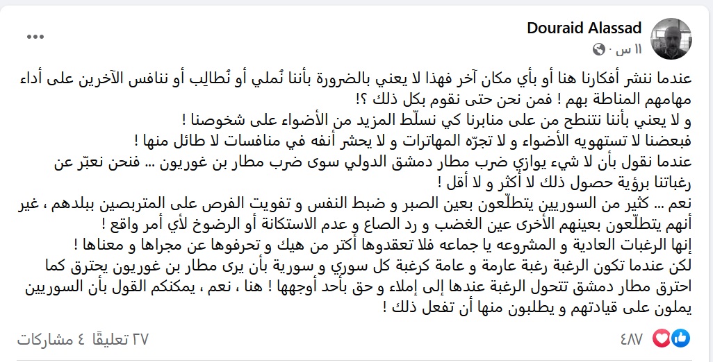 وختم: “لكن عندما تكون الرغبة رغبة عارمة و عامة كرغبة كل سوري و سورية بأن يرى مطار بن غوريون يحترق كما احترق مطار دمشق تتحول الرغبة عندها إلى إملاء و حق بأحد أوجهها ! هنا ، نعم ، يمكنكم القول بأن السوريين يملون على قيادتهم و يطلبون منها أن تفعل ذلك !”.