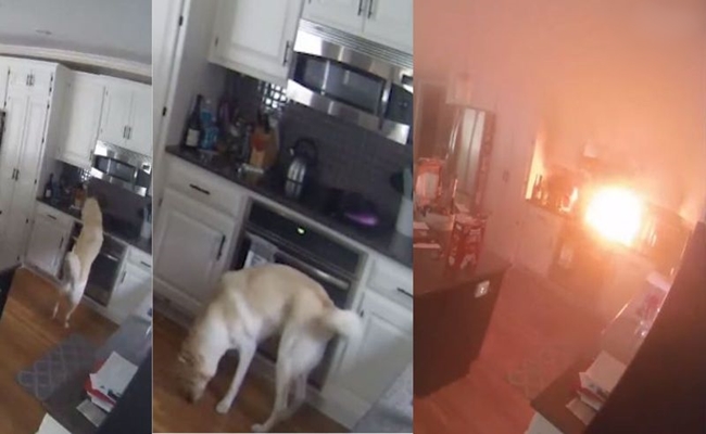 كلب يتسبب باشتعال النار في منزل ( فيديو )