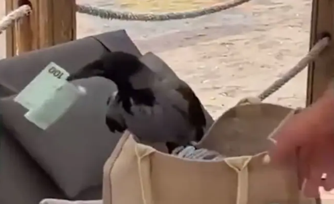 Antalya’da bir otelin sahilinde karga, turistlerin çantasından 100 avro para aldı.