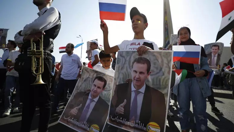 احتفل العشرات من مؤيدي الرئيس السوري بشار الأسد، الإثنين، بعيد العلم الروسي في ساحة الأمويين بالعاصمة، دمشق، حاملين علم روسيا ولافتات تحمل صورة الأسد كتب عليها “الأمل بالشباب”.