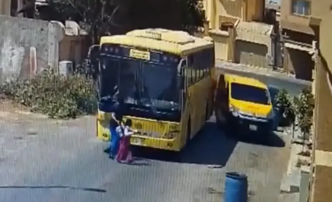 في التفاصيل ظهرت الطالبة، وهي تحمل حقيبتها على ظهرها وتنزل من باص المدرسة، الذي توقف وسط الشارع.