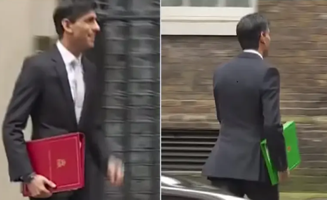 ووفق ما اوردت قناة “العربية” السعودية، نرى سوناك في الفيديو الذي انتشر سريعا بمواقع التواصل، وهو يخرج من مقر الحكومة في “10 داونينغ ستريت” بلندن، ثم يمشي على الرصيف حاملا الملف بيمناه، ويمر بجانب سيارات متوقفة، ثم تحجب إحداها الملف لفترة وجيزة عن الأنظار، وعندما خرج من مجال الحجب، بدا أن لون الملف تغير إلى الأخضر، في لحظة مربكة حيّرت المشاهدين.