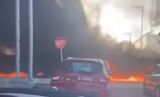 تداولت مواقع التواصل الاجتماعي مقطع فيديو، يظهر قطار شحن في المكسيك يمر وسط نيران كثيفة، بعد أن اصطدمت شاحنة وقود بالجسر الموجود فوق سكة الحديد.