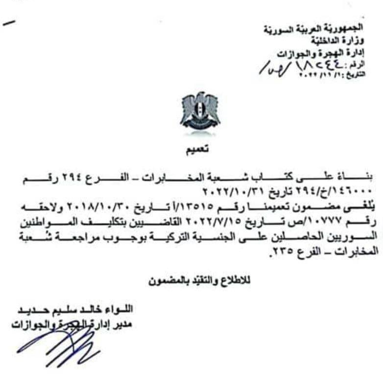 ألغت إدارة الهجرة والجوازات في سوريا تعميما سابقا يقضي بمراجعة السوريين الحاصلين على الجنسية التركية فرع فلسطين.