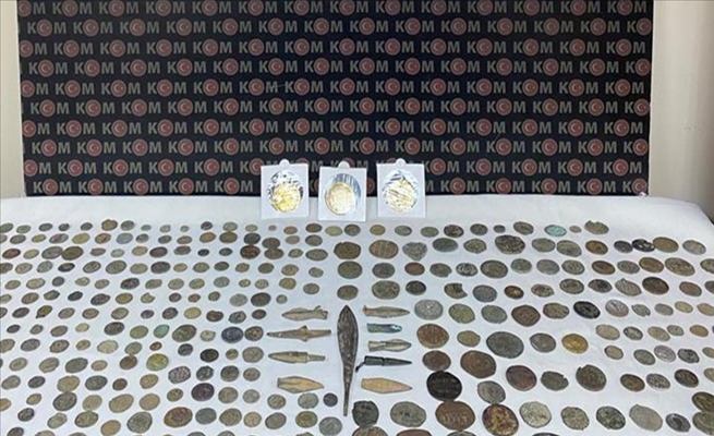 وصادرت الفرق 431 قطعة من العملات الأثرية يعتقد أنها تعود للحقب اليونانية والرومانية والبيزنطية والعثمانية، إضافة إلى 16 رأس سهم، وقلادة. (Anadolu)