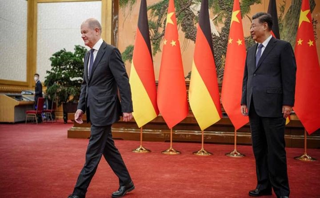 بعد الهزة العنيفة التي تعرض لها الاقتصاد الألماني عقب انقطاع امدادات الطاقة من روسيا، المورد الرئيسي للغاز الطبيعي، بدأ الجمهور الألماني يناقش بجدية خطورة الاعتماد الاقتصادي على الصين، التي حلت كأكبر شريك تجاري لألمانيا على مدى السنوات الست الماضية، وطالبوا الحكومة بتغيير الاستراتيجية الاقتصادية للبلاد مع الصين.