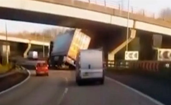 في بريطانيا .. انقلاب شاحنة كاد يؤدي إلى كارثة ( فيديو )