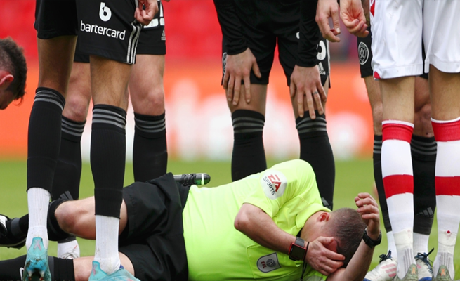 إصابة حكم في الدوري الإنكليزي و إخراجه من الملعب بنقالة ( فيديو )