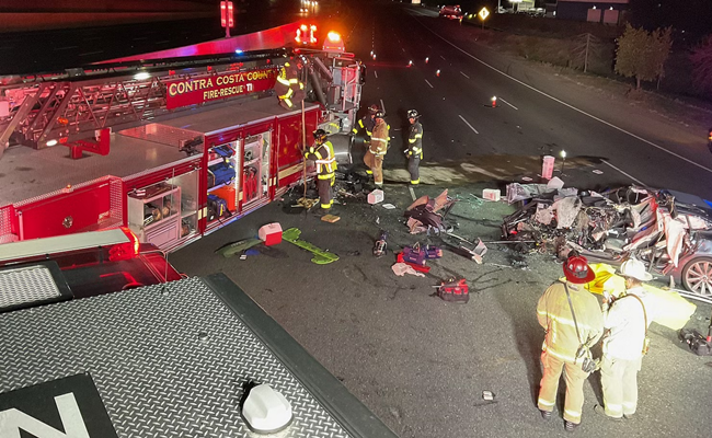 وأظهرت صور نشرها حساب إدارة الإطفاء في مقاطعة كونترا كوستا على تويتر تهشم الجزء الأمامي من السيارة بشكل كامل بعد اصطدامها بشاحنة الإطفاء.