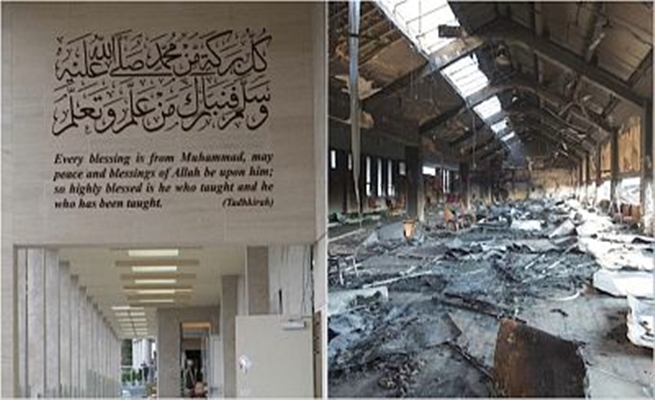لم تتأثر قاعة الصلاة الضخمة بالحريق لكن المبنى الإداري بالمسجد الذي يضم غرف المناسبات قد احترق.