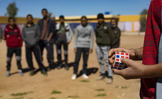 في الباحة الخارجية، يتفيأ بعض الأطفال تحت ظلال أشجار، بينما يلهو آخرون بمكعّب روبيك.