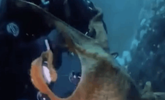 أخطبوط عملاق يلتف حول عنق غواص و يسحبه 40 قدماً تحت الماء ( فيديو )