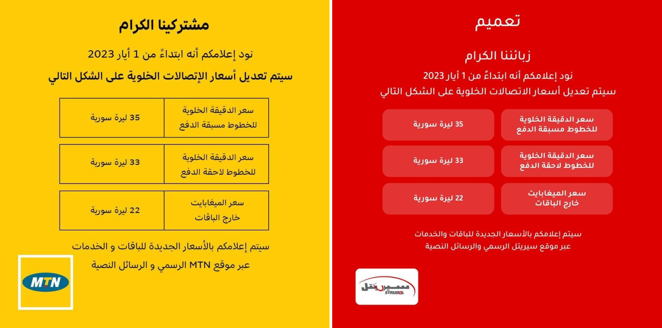 يذكر أن الزيادة الجديدة تأتي بعد أقل من عام على رفع أجور مكالمات شركتي الاتصالات الخلوية سيرياتيل وإم تي إن.