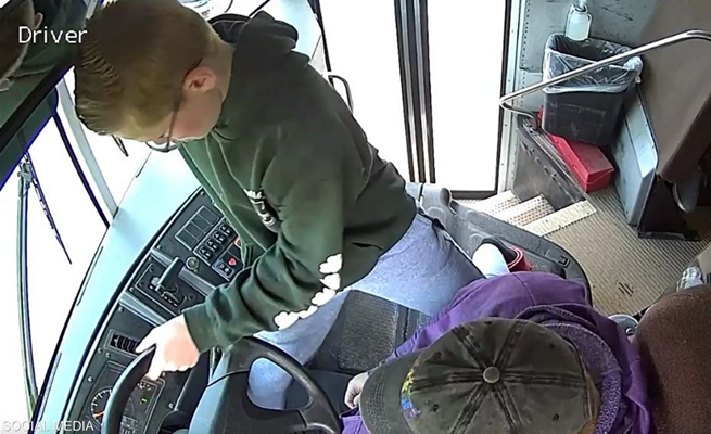 ويظهر الفيديو، الذي صورته كاميرا مراقبة يوم الأربعاء الماضي، لحظة إغماء السائقة، ونهوض المراهق من مقعده للسيطرة على مقود الحافلة، التي كان على متنها نحو 70 طفلا في طريق مزدحم.