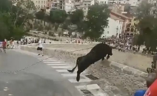 وأظهرت لقطات درامية للثور وهو يقفز من علو 50 قدما إلى الهاوية بعد أن أطلق سراحه ليهاجم الحشود خلال مهرجان في إسبانيا.