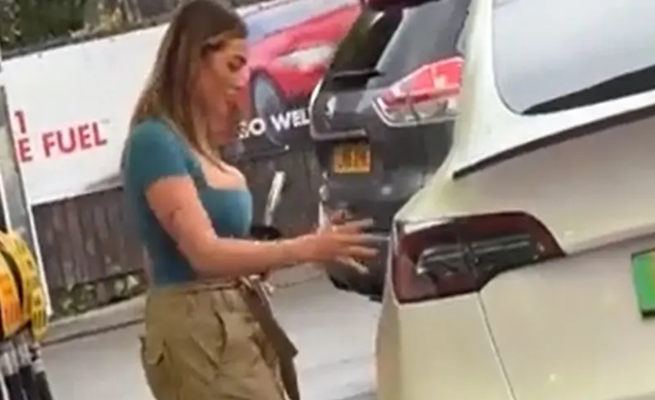 ويظهر في المقطع القصير سيدة في إحدى محطات الوقود في بريطانيا وهي تحاول أن تملأ الوقود في سيارة من نوع “تيسلا”، وهي كهربائية بالكامل، فيما كان أحد الزبائن في نفس المحطة يقوم بتصويرها من داخل سيارته، ومن ثم قام بنشر مقطع الفيديو.