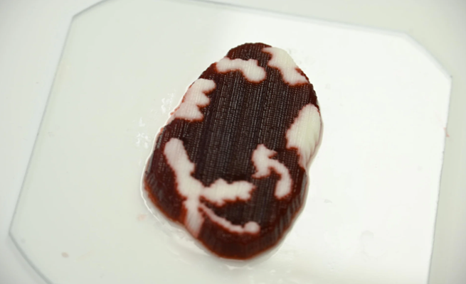 وبعد ذلك تُحوّل تلك الخلايا العضلية والدهنية المتمايزة إلى أحبار حيوية (تركيبة من الخلايا ومواد الترابط) وتُوضع بخراطيش في الطابعة ثلاثية الأبعاد. وتسمح عملية الطباعة لشرائح اللحم بأن تكون قابلة للتخصيص من خلال منح المستهلكين خيار اختيار تركيبة الدهون في قطع اللحم.