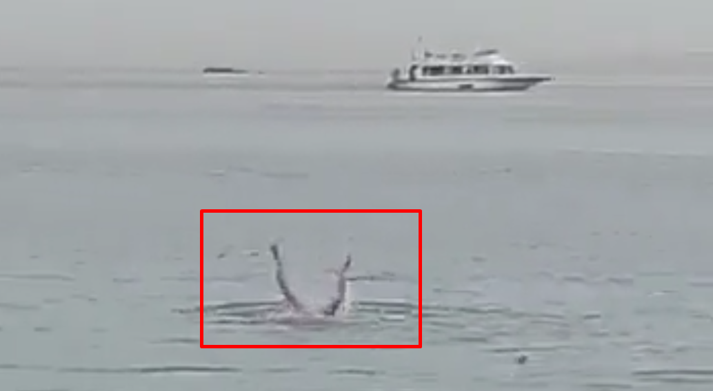 ويظهر الشريط شخصا يصارع في عرض البحر، قبل أن تطفو على سطح الماء قربه زعانف القرش الذي قام بمهاجمته.