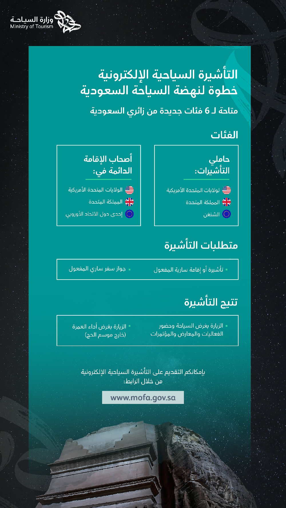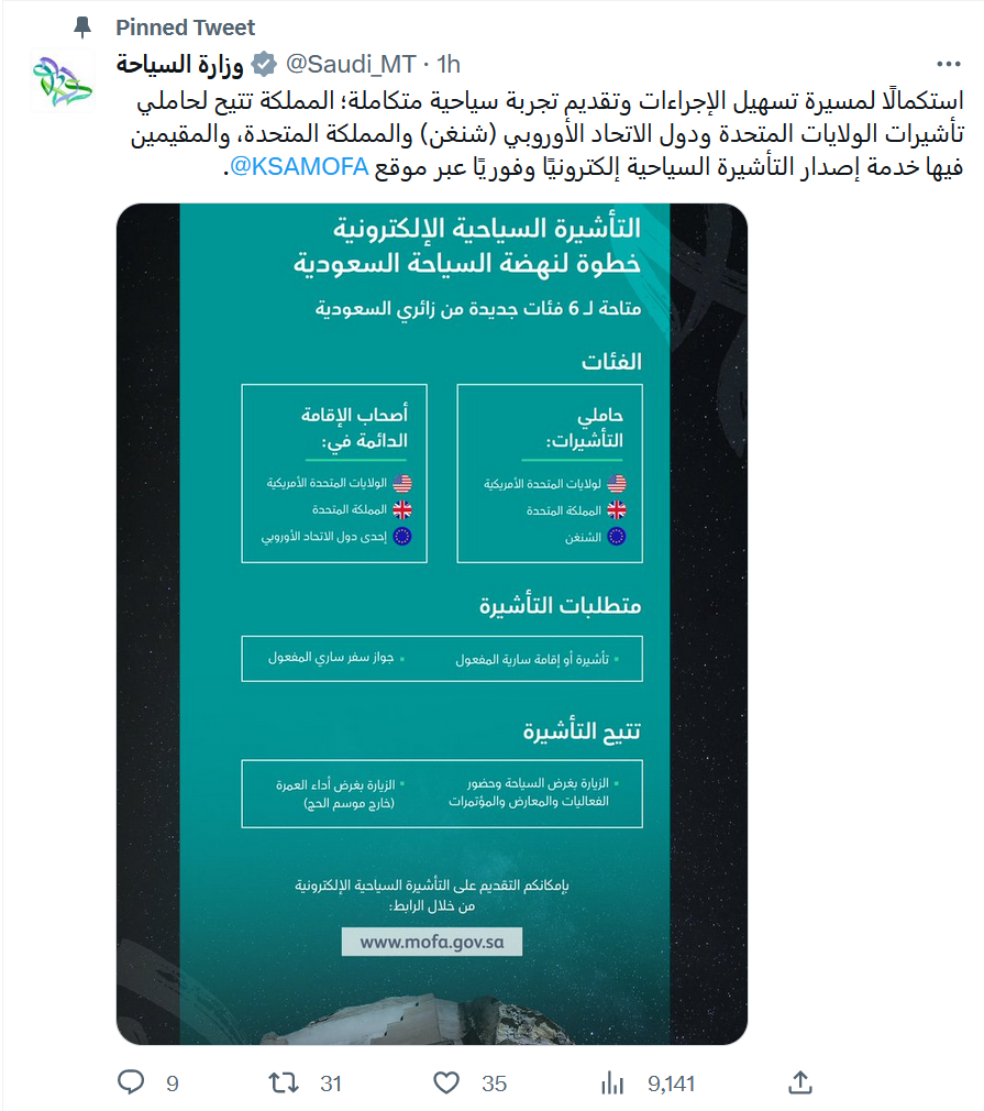 أعلنت وزارة السياحة السعودية عن تسهيلات جديدة لتمكين حاملي تأشيرات الزيارة للولايات المتحدة الأميركية أو المملكة المتحدة أو تأشيرة شنغن وأصحاب الإقامة الدائمة في دول الاتحاد الأوروبي والولايات المتحدة الأميركية والمملكة المتحدة من الحصول على تأشيرة إلكترونية فورية من خلال موقع وزارة الخارجية السعودية.