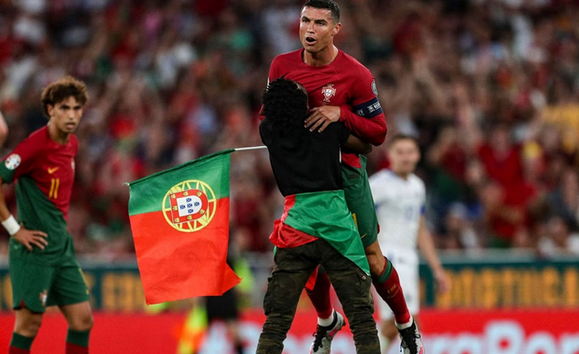 مشجع يقتحم مباراة البرتغال و البوسنة و الهرسك و يحمل كريستيانو رونالدو ( فيديو )