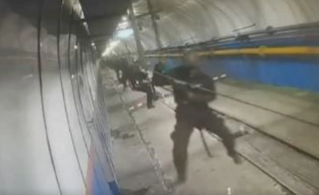 ويبدو العمال بداية الفيديو معلقين بحبال على سكة يدخلون واحدا تلو الآخر إلى المنجم.