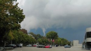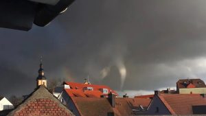dpatopbilder – Ein Tornado ist am späten Nachmittag des 09.03.2017 über den Dächern vorn Kürnach bei Würzburg (Bayern) zu sehen. «Es wurden 20 bis 30 Dächer abgedeckt, zwei Bäume umgeknickt und Gartenhäuschen umgeweht», sagte ein Polizeisprecher. Verletzt wurde niemand. (zu dpa «Tornado über Unterfranken deckt mehrere Dächer ab» vom 09.03.2017) ACHTUNG: Nur mit Urhebernennung Foto: Detlef Dücker/dpa ++