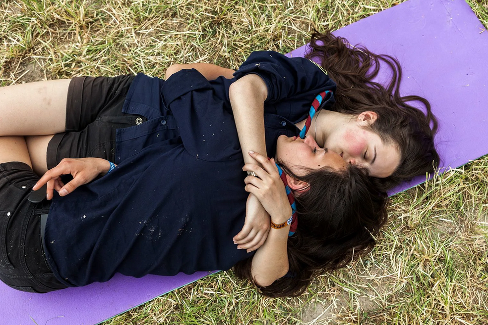 وخلال لحظاتٍ هادئة، تشبك الفتيات أيديهنّ معًا، ويتكئنّ على بعضهنّ البعض، بينما تنفجر إحداهن ضحكًا، وهي تمسك بقدم شخصٍ آخر لدغدغته.