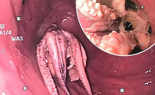 أجرى الأطباء هناك فحصا سريعا بالأشعة المقطعية، والذي كشف عن وجود كتلة فائقة الكثافة في مريء الرجل، لكنهم لم يتمكنوا من التأكد مما كانت عليه دون تنظير المريء، والذي يتضمن إدخال أنبوب صغير ومرن بكاميرا في نهايته، واكتشفوا بها أن الرجل لديه أخطبوط كامل عالق في حلقه.