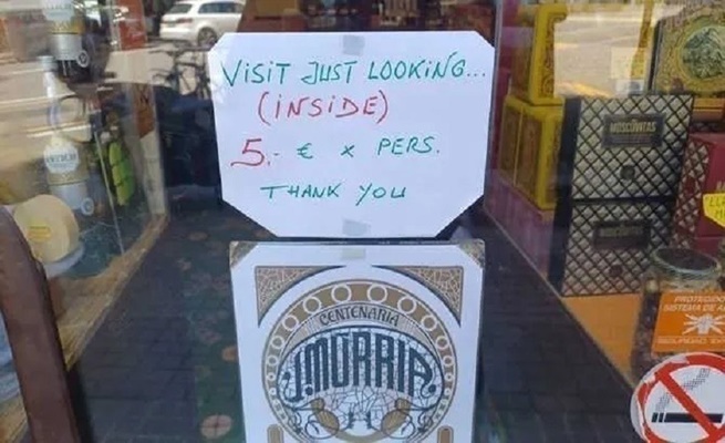 وضع مالكو Queviures Múrria، وهو متجر بقالة في برشلونة، لافتة تعلن عن تقاضي 5 يوروات (5.6 دولار) مقابل الحضور فقط للنظر، بعد أن ضاقوا ذرعاً بالسياح الذين يأتون فقط لمشاهدة السلع من دون أن يشتروا أياً منها.