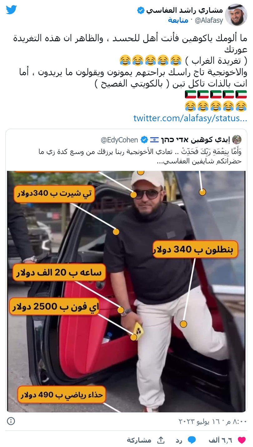 وقع سجال كلامي بين القارىء والمنشد الكويتي مشاري بن راشد العفاسي والإعلامي الإسرائيلي إيدي كوهين، على خلفية الجدل الذي أثاره ظهور في سيارة فارهة.
