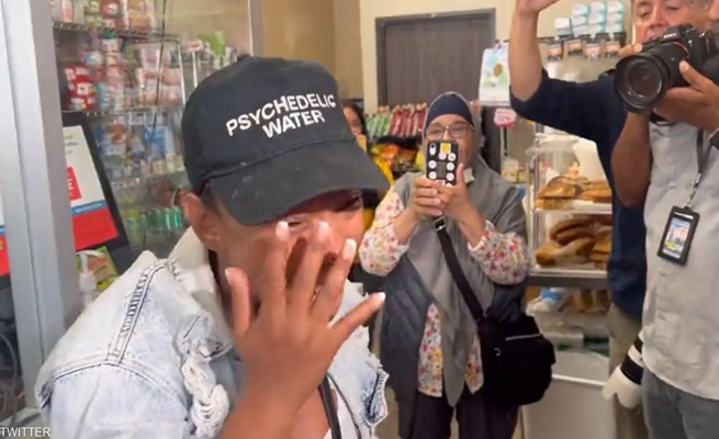 تمكنت من الإيماء عندما سئلت عما إذا كانت هي الفائزة، لكن عندما هرعت للخروج من المتجر، انهارت المرأة على ركبتيها واستمرت في البكاء وهي تلوح بيديها في الهواء.