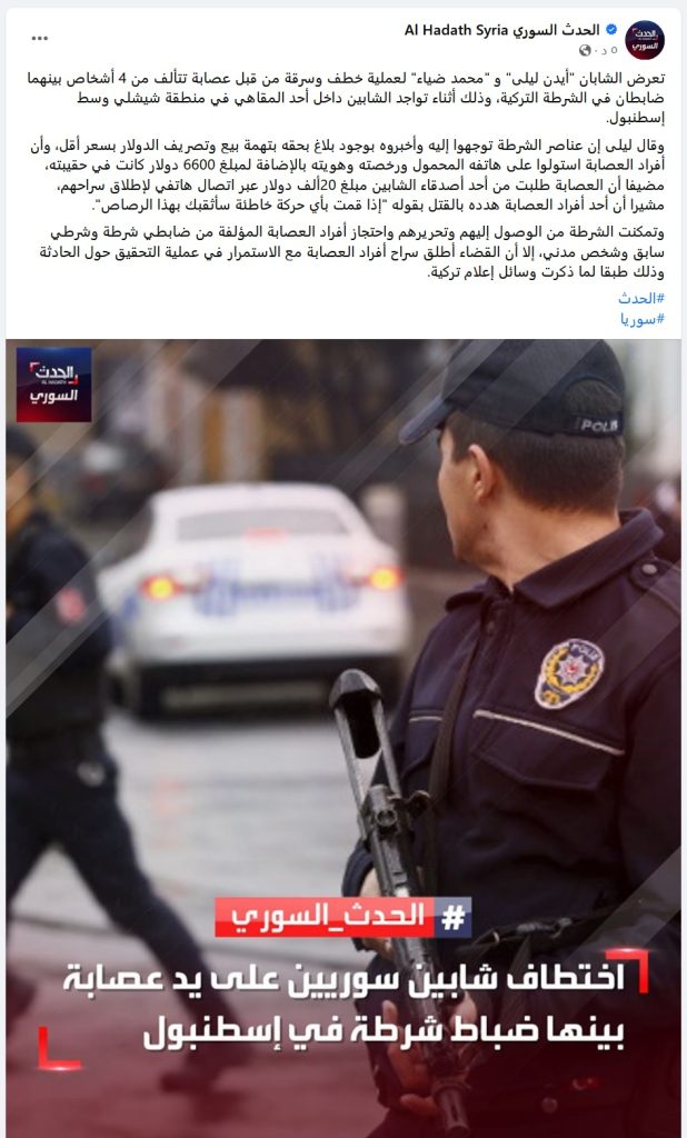 قالت قناة العربية الحدث السعودية، إن شابين سوريين تعرضا للاختطاف على يد عصابة بينها ضباط شرطة في اسطنبول.