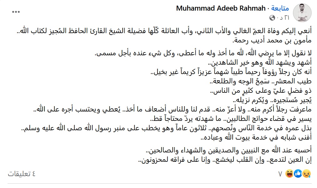 وذكرت المصادر إلى جانب أقرباء لرحمة أنه توفي اليوم، وأضافت أن الوفاة حدثت في مسجد العادل بدمشق عند أداء صلاة العصر.