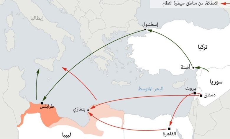 يصل السوريون إلى ليبيا المقسمة بين غرب وشرق عبر مدخلين رئيسيين: بنغازي شرقا، أبرز مدن معسكر المشير خليفة حفتر الذي تربطه علاقات بدمشق، أو طرابلس (غرب) حيث الحكومة المعترف بها من الأمم المتحدة وتعدّ تركيا من داعميها.