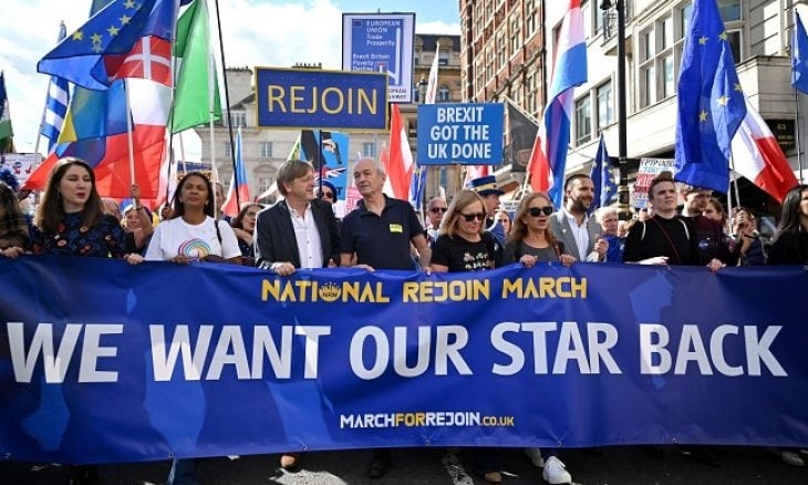 ورفع المتظاهرون لافتات كُتب عليها: “طريق الانضمام مجدداً للاتحاد الأوروبي تبدأ من هنا”، و”انضموا مجدداً وابتهجوا”.
