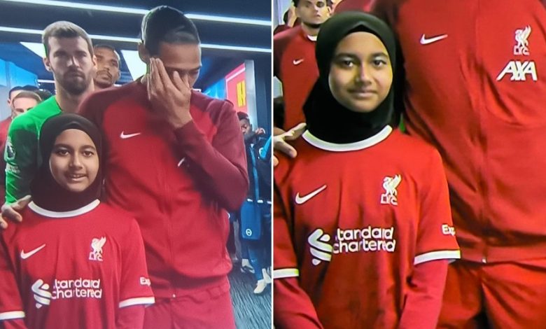 خطفت فتاة محجبة الأنظار، بدخولها إلى جانب فيرجيل فان دايك، لاعب نادي ليفربول، إلى أرض ملعب “فالمر” الذي يحتضن مباراة “الريدز” وبرايتون، الأحد، ضمن منافسات الدوري الإنجليزي الممتاز.