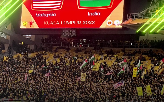 جماهير ماليزية تهتف دعماً لغزة و ترفع الأعلام الفلسطينية أثناء مباراة لمنتخب بلادهم ( فيديو )