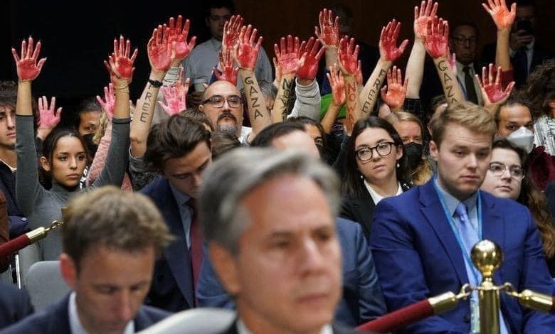 ” الفلسطينيون ليسوا حيوانات ” .. محتجون يقاطعون كلمة وزير الخارجية الأمريكي في الكونغرس ( فيديو )