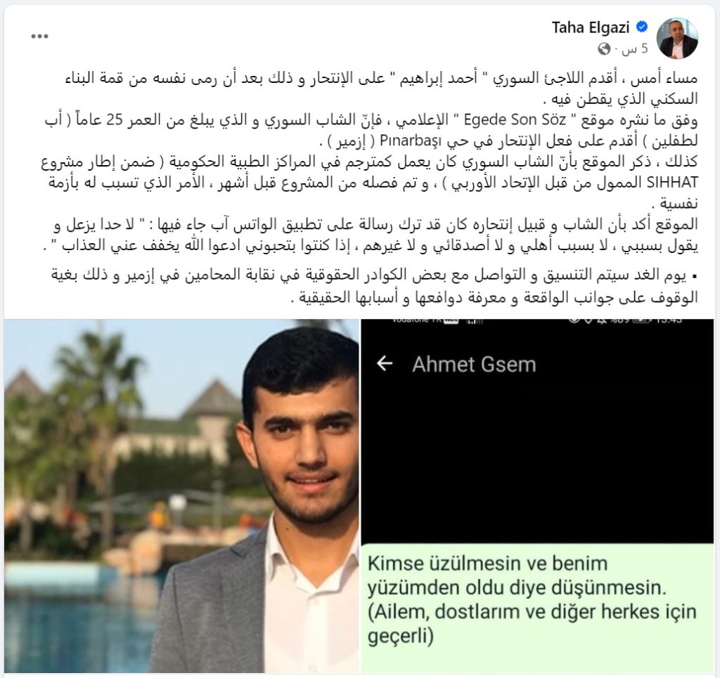 وذكرت وسائل إعلام تركية، أن السوري أحمد ابراهيم (25 عاماً) أب لطفلين، ألقى بنفسه من قمة البناء السكني الذي يقطنه في منطقة بينار باشا.