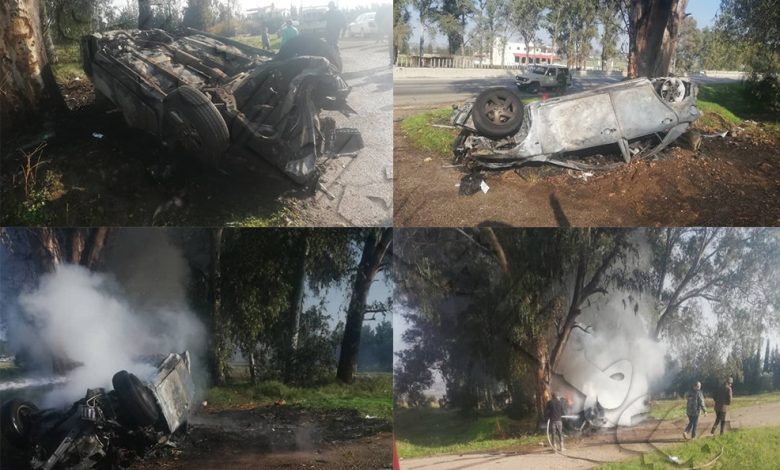 وذكرت وزارة الداخلية النظامية أن “مركبة مازدا زوم تدهور على طريق طرطوس – حمص نتيجة انفجار أحد عجلاتها، ما أدى إلى انقلابها واحتراقها بالكامل”.