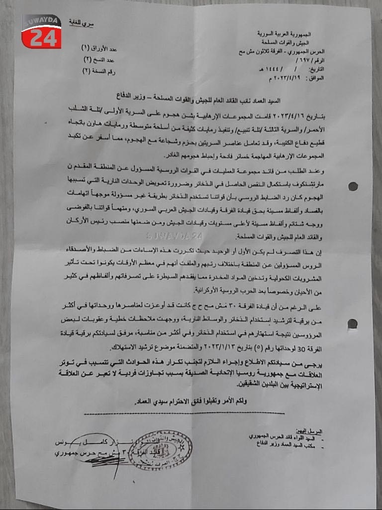 البرقية المرسلة في تاريخ 16 نيسان الفائت، من قائد الفرقة 30 التابعة للحرس الجمهوري في الجيش السوري، إلى وزير الدفاع، اشتكى فيها قائد الفرقة من توجيه ضابط روسي برتبة مقدم، إساءات إلى الجيش السوري، بسبب استهلاك الذخائر بطريقة عشوائية وغير منظمة، على أحد محاور القتال في ريف حلب.