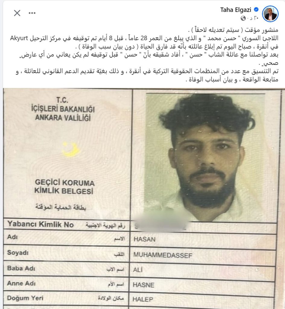 وقال الناشط السوري طه الغازي إن “اللاجئ السوري حسن محمد (28 عاماً) تم توقيفه قبل أيام في مركز ترحيل في أنقرة”.