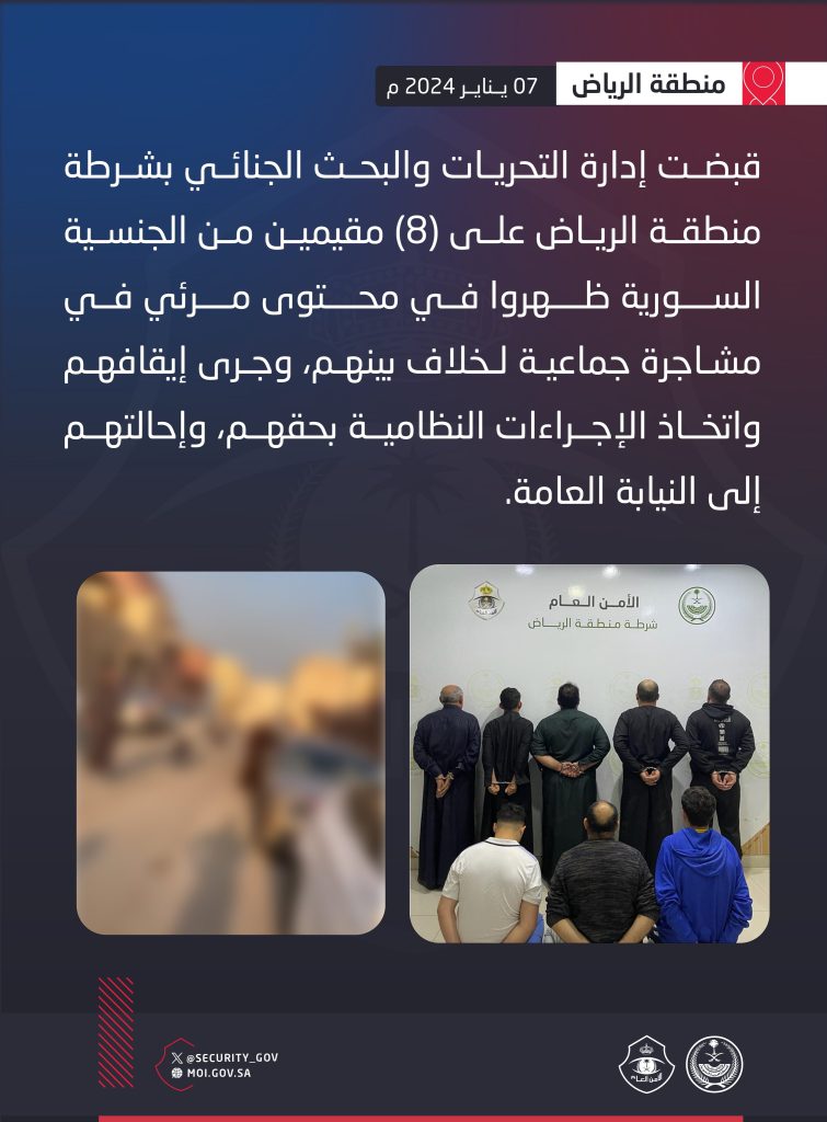 وقال الأمن العام السعودي في منشور عبر حسابه الرسمي على منصة “إكس”، تويتر سابقا: “قبضت إدارة التحريات والبحث الجنائي بشرطة منطقة الرياض على (8) مقيمين من الجنسية السورية، ظهروا في محتوى مرئي في مشاجرة جماعية لخلاف بينهم”.