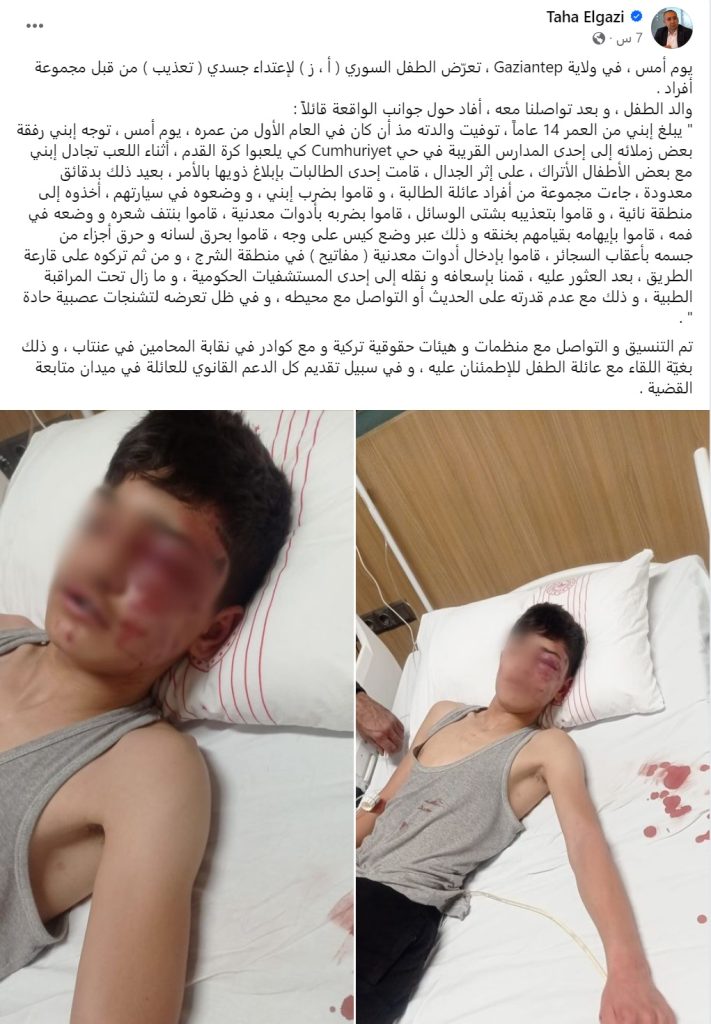 وذكر الغازي في منشور عبر حسابه في فيسبوك أن والد الطفل أكد الواقعة وقال إن ابنه يبلغ من العمر 14، وقد “توجه رفقة بعض زملائه إلى إحدى المدارس القريبة في حي جمهورييت كي يلعبوا كرة القدم، وأثناء اللعب تجادل إبني مع بعض الأطفال الأتراك”.