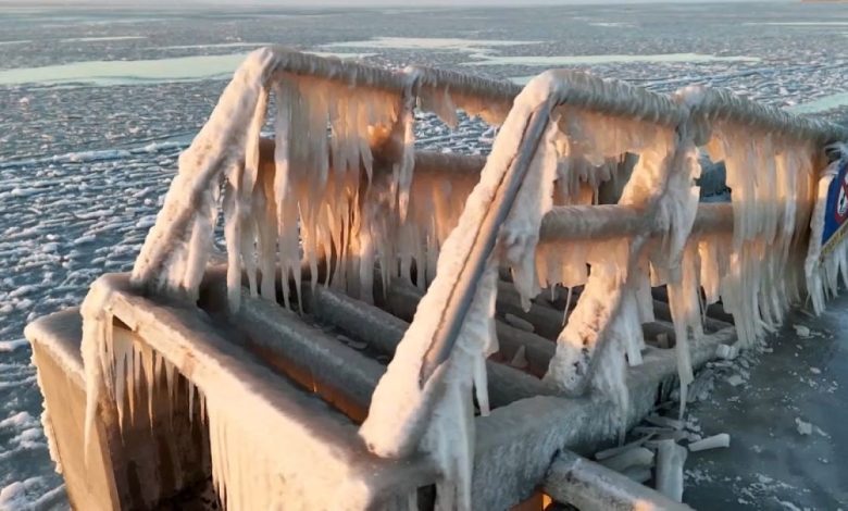 أوروبا : تدني درجات الحرارة يحوّل بحيرة إلى ساحة للتزلج و يؤدي إلى ظهور أشكال جليدية غريبة ( فيديو )
