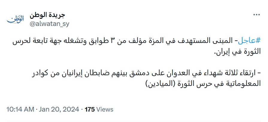 ونقلت وكالة «رويترز» عن مصدر في تحالف إقليمي مؤيد لسوريا قوله إن الغارة الإسرائيلية على دمشق قتلت مسؤولا بـ«الحرس الثوري» الإيراني.